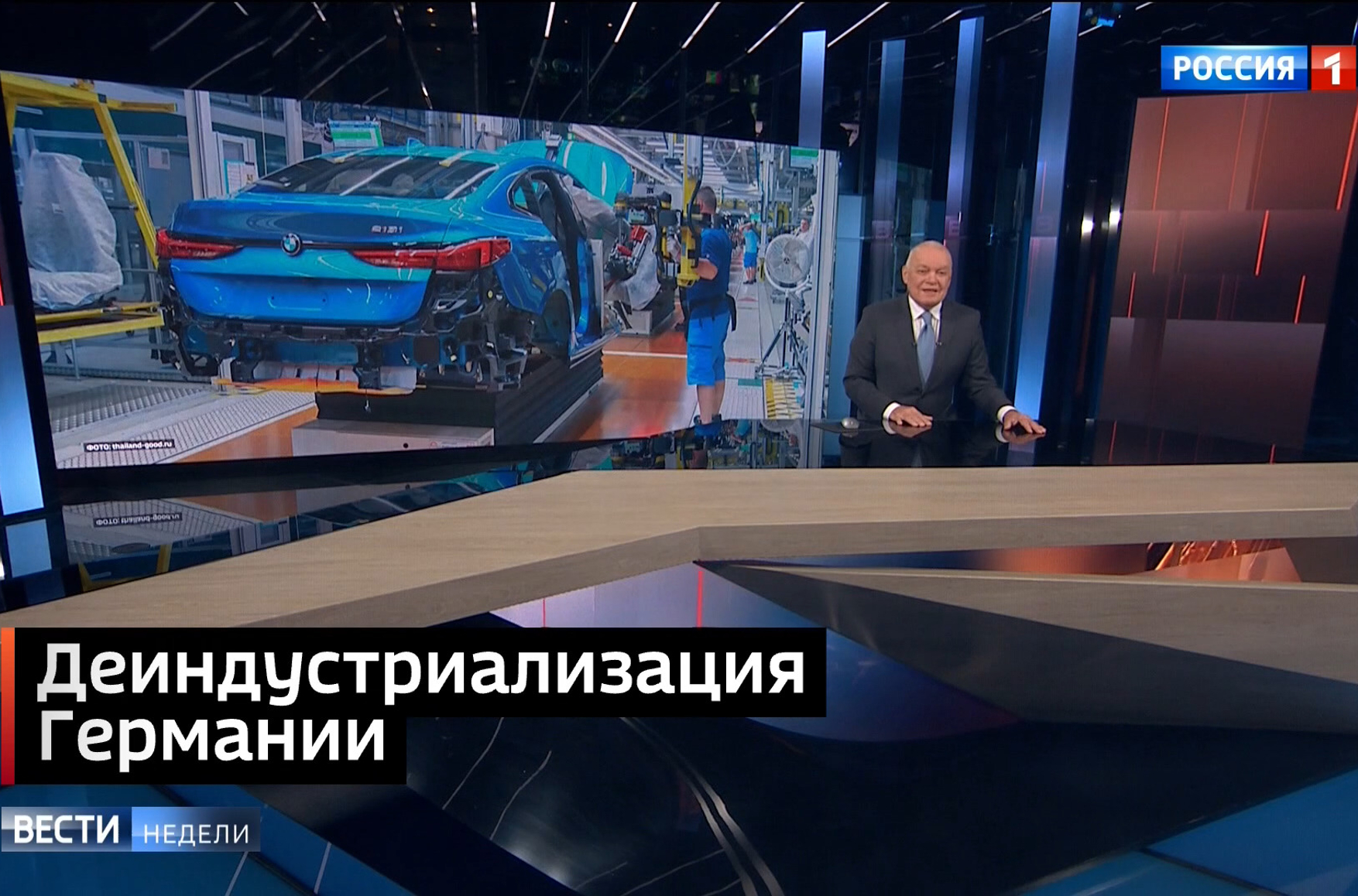 Очередной разоблачительный монолог в «Вестях недели» Дмитрий Киселев посвятил трудностям немецкого автопрома, который якобы страдает из-за разрыва экономических связей с Россией. На сайте программы этот фрагмент озаглавили «Бумерангом по „бумеру”: санкции против РФ рикошетят в немецкий автопром», а говорит в нем Киселев вот что: