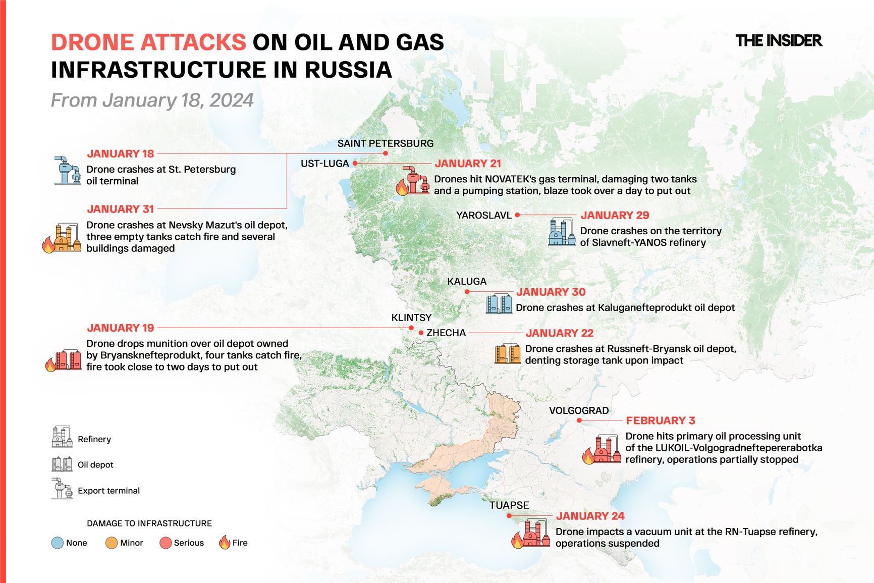 Since the start of 2024, Ukrainian drones have struck twelve Russian refineries, but so far there have been few truly destructive hits. The first serious impact occurred at one of Russia's largest oil refineries — Rosneft's facility in the southern city of Tuapse. According to The Insider's source in the city administration, a vacuum column at the refinery caught fire as a result of the strike. As per Reuters, the facility’s operations have been halted until March.