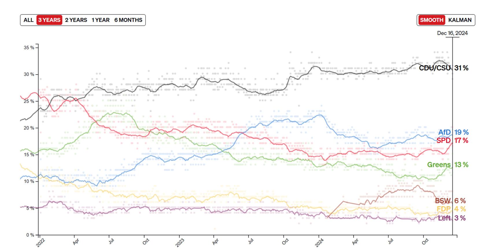 Throughout 2024, the AfD consistently ranked second in national polls, behind only the CSU/CDU (31-33%). Its popularity currently stands at 17-19%, with its closest competitor for runner-up, the Social Democrats (SPD), coming in at 16-17%. The party traditionally enjoys higher levels of support in the former East Germany, reaching up to 30%, but contrary to stereotypes, it also has significant backing in several western regions, including the economically successful states of Bavaria, Baden-Württemberg (both 16%), and Hesse (17%).