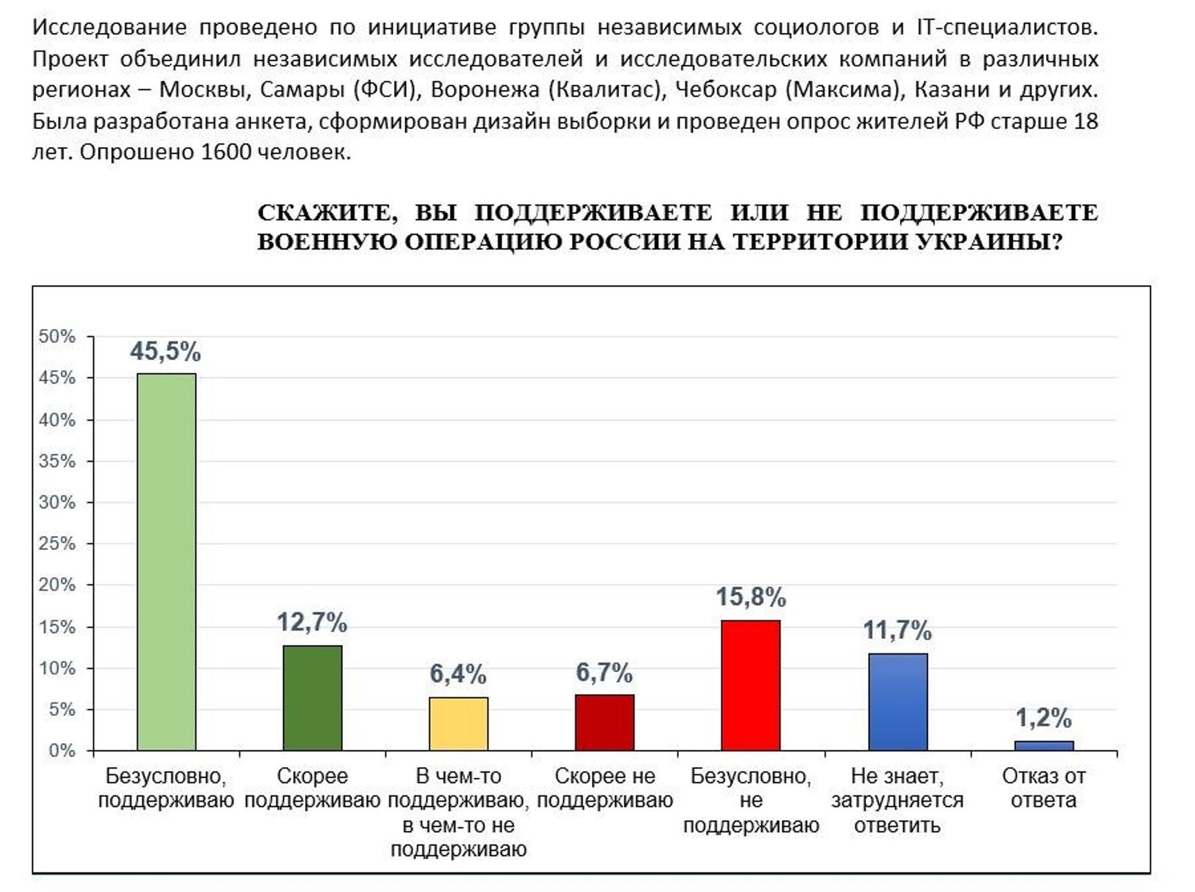 The study was conducted at the initiative of a group of independent sociologists and IT professionals. The project brought together independent researchers and analytical companies from multiple regions: Moscow, Samara (FSI, Social Research Foundation), Voronezh (Qualitas), Cheboksary (Maksima), Kazan, and more. The research team developed a questionnaire, designed the sample, and questioned 1600 Russian residents aged over 18.