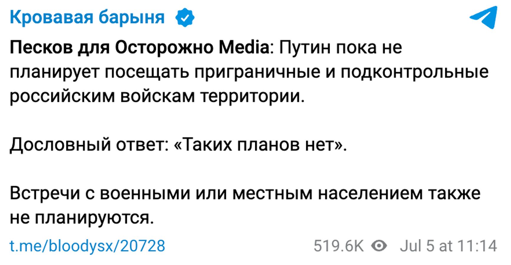 При этом 5 июля Песков заявил, что Путин «пока не планирует посещать приграничные и подконтрольные российским войскам территории». В каком именно заявлении он озвучил прессе реальные планы президента, неизвестно.