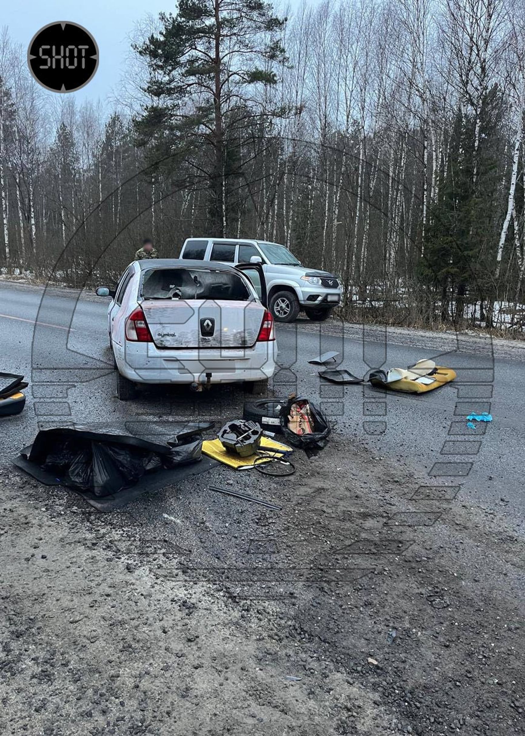«Публикуем первое фото расстрелянного «Рено Симбол», который не остановился по требованию силовиков в районе деревни Хацунь Карачинского района Брянской области. В авто были четверо мужчин. Двоих задержали, двое сбежали. Машина досмотрена. В ней были пистолет и автомат».