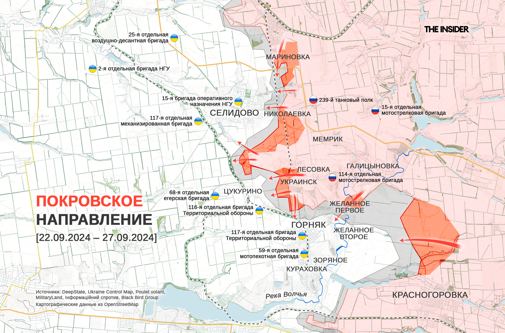 DeepState пишет о продвижении ВС РФ около Новогродовки, Николаевки, Цукурино и в Мариновке на покровском направлении, а также в Нью-Йорке (в 1951–2021 годах — Новгородское) на торецком направлении. В свою очередь WarGonzo сообщает о продвижении российских войск в восточной части городской застройки Угледара. По оценке CIT, на этом участке ВСУ пришло время организовывать арьергардные бои для вывода гарнизона из города, чтобы избежать окружения.