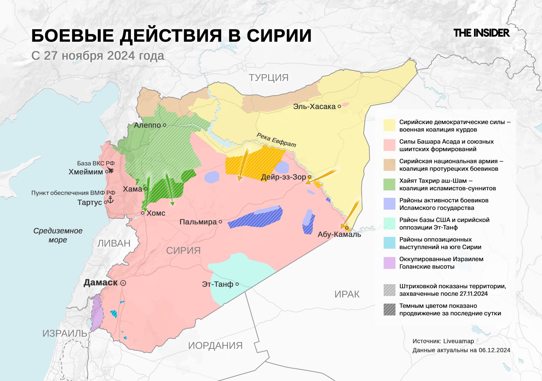 6 декабря сирийские повстанцы продолжили наступление, и колонны «Сирийских демократических сил» (СДС) вошли в два города на востоке Сирии: Дейр-эз-Зор и Абу-Кемаль — которые ранее контролировались режимом Башара Асада. Этот шаг перекрыл сухопутный коридор снабжения, используемый проиранскими группировками, в том числе «Хезболлой».