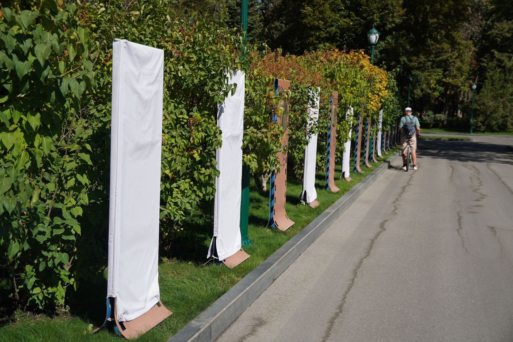 На некоторых из табличек надписи проступают через плотно прилегающую ткань. И если приглядеться, можно прочитать имена тех, кого хотели спрятать. Вот композитор Максим Дунаевский — любитель отдыха в оккупированном Крыму. А вот уроженец Черниговщины и выпускник Харьковского театрального института Алексей Петренко, который с 2014-го и до своей смерти в Москве в 2017 году так прилюдно и не смог ни разу объяснить свое отношение к войне, развязанной Россией против его родной Украины.