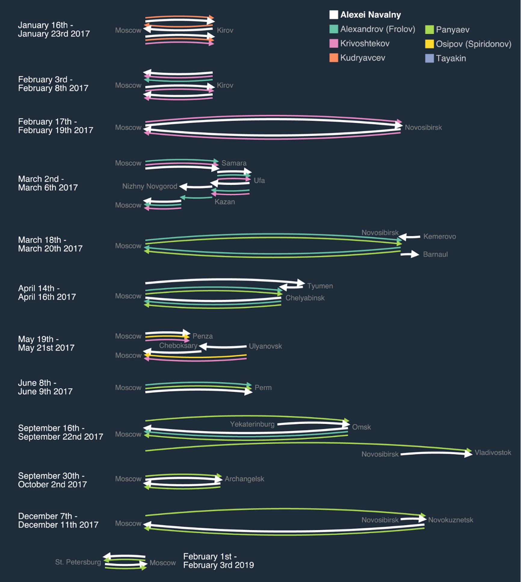 Анализ предыдущих поездок членов этой группы отравителей показывает, что они начали следить за Алексеем Навальным как минимум с января 2017 года, то есть сразу после того, как он объявил о своих планах участвовать в президентских выборах в России в 2018 году. В рамках своей предвыборной кампании в течение 2017 года Навальный совершил более 20 предвыборных поездок за пределы Москвы. ФСБшники-отравители следили за ним практически во всех этих поездках, за исключением нескольких однодневных, которые не требовали от него ночевки в пункте назначения. Всего эти сотрудники ФСБ совершили 47 поездок по тем же направлениям, куда летел или ехал Алексей Навальный.
