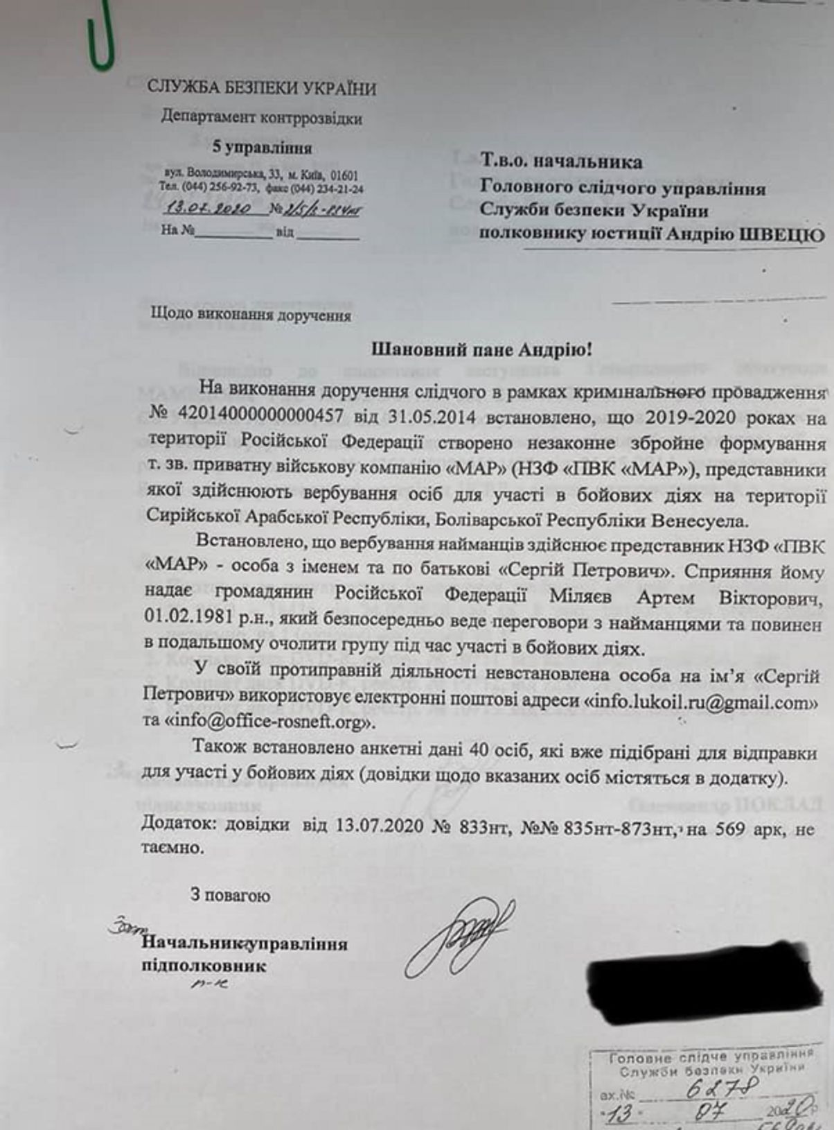 Хотя СБУ активно помогала операции, формально нужно было выставить все так, что СБУ о боевиках узнает случайно (ведь по легенде самолет сажают из-за звонка бдительного гражданина). Для этого придумали еще одну легенду: анонимный информатор сообщал СБУ о продолжающейся незаконной операции по вербовке наемников и называл адрес и пароль к электронной почте — info @rosneft-office. org. Как только СБУ отреагирует на такую ​​наводку, они смогут загрузить все тысячи страниц компрометирующих документов, включая резюме, фотографии и видео. СБУ также сможет отслеживать подготовку к отъезду наемников из России с помощью билетов и планов полетов. И главное — они смогут немедленно отреагировать, как только обнаружат, что — случайно, после предупреждения о взрыве — самолет, на котором находились эти заинтересованные лица, приземлился в аэропорту Борисполь под Киевом.
