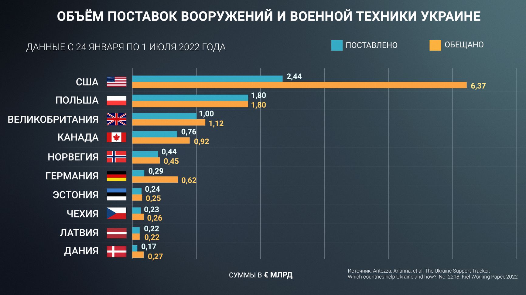 На самом деле, по подсчетам Института мировой экономики из города Киль (Германия), общий объем анонсированной военной помощи Украине составляет около €20 млрд, а стоимость поставок ВВТ из них не превышает €14 млрд (остальное — целевые финансовые средства). И вот из этих анонсированных €14 млрд в руки украинских военных передано вооружений всего на €8,5 млрд. Скажем, США объявили о поставках ВСУ военной техники на €6,4 млрд, а реально поставили всего на €2,4 млрд. Другие военно-политические партнеры Киева гораздо оперативнее исполняют свои обязательства, но их объем на общем фоне невелик.